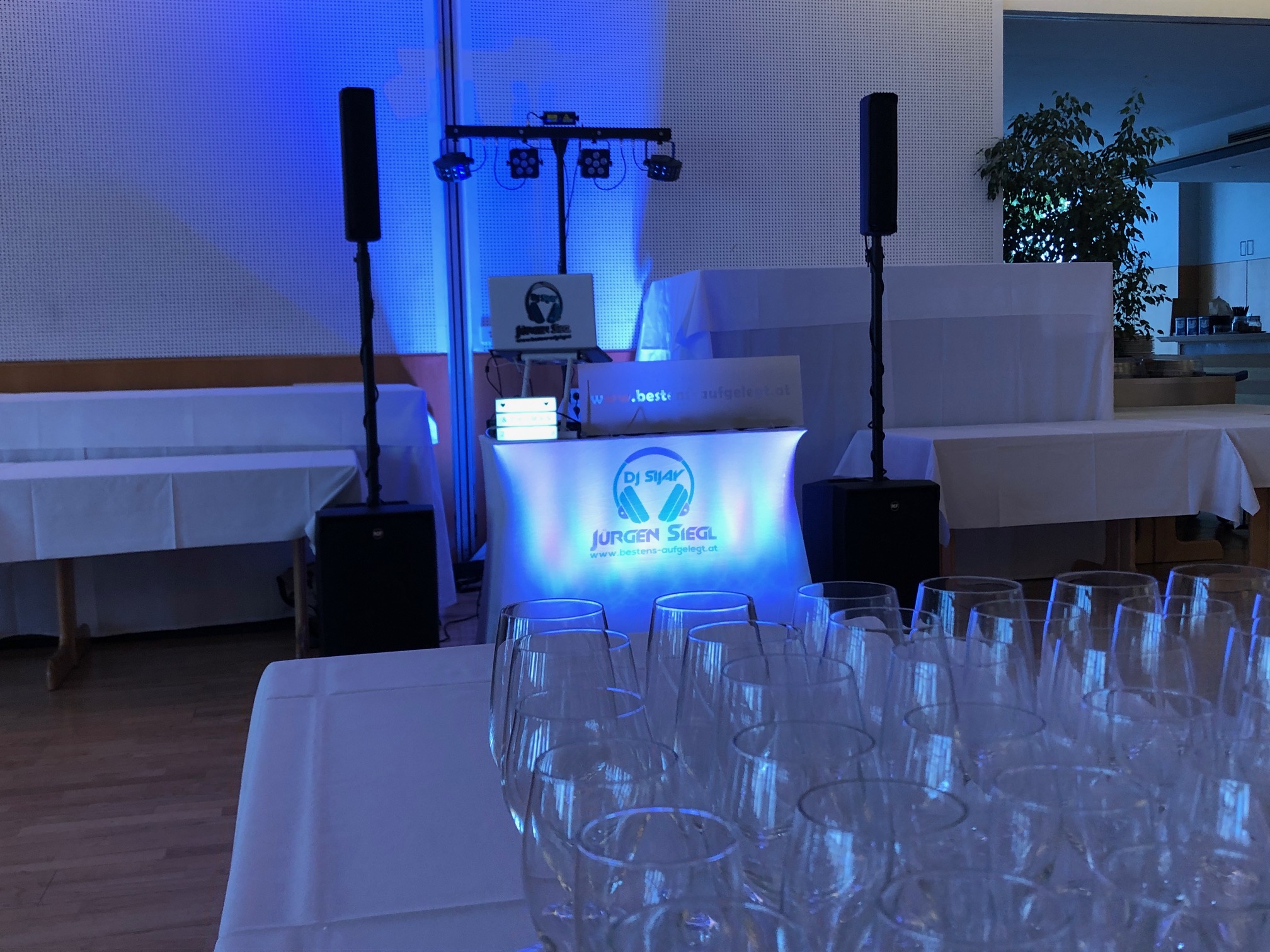 Jürgen kam früh zu unserer Location, um alles in Ruhe aufzubauen. Schon alleine dadurch hebt er sich von vielen aus seiner Branche ab: Während Berufskollegen von Jürgen ihren Laptop auf ein Tischerl mit Rüschentischtuch vom Wirtshaus ausbreiten, baut Jürgen mit Ruhe und seinem Blick für Ästhetik sein zahlreich mitgebrachtes Equipment auf. Dazu gehört eben nicht nur ein einfaches DJ-Pult und Turntables, sondern auch Boxen, die den Saal in bester Tonqualität beschallen. Außerdem hat er unsere Location (Fernblick in St. Corona) mit seiner Beleuchtung in optisch passenden rosa- und grünfarbenen Tönen nochmals schöner gemacht.